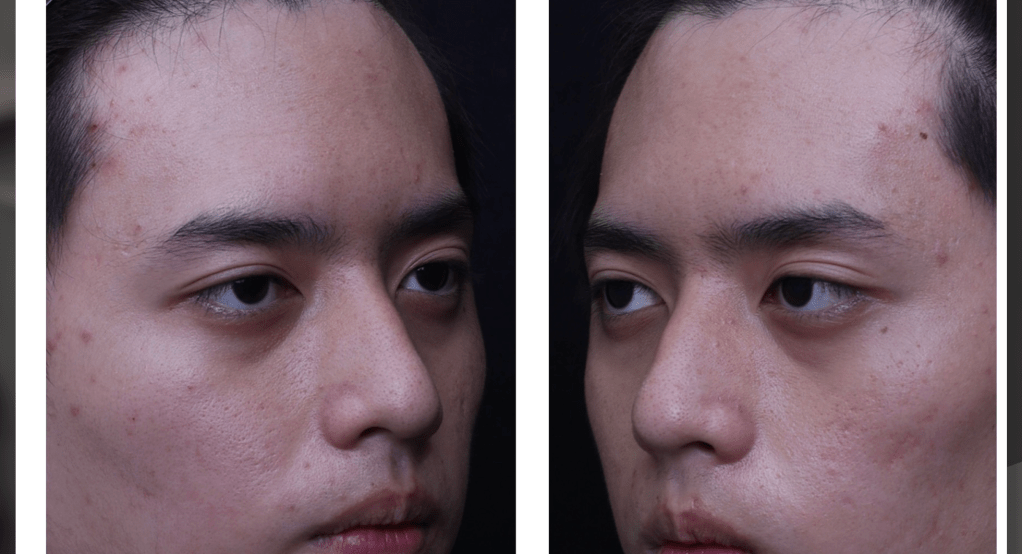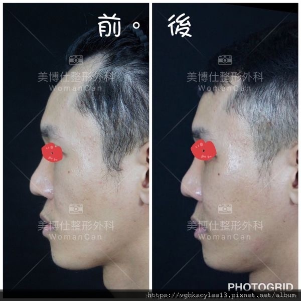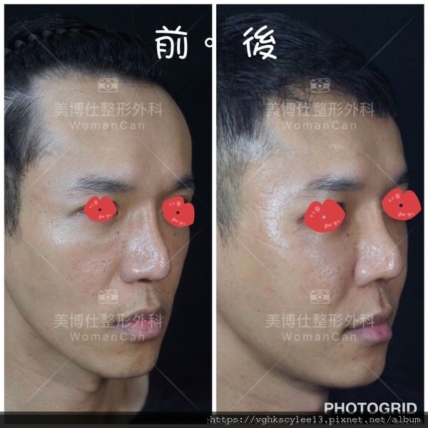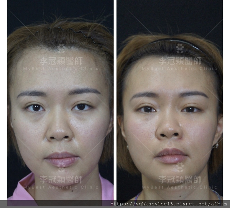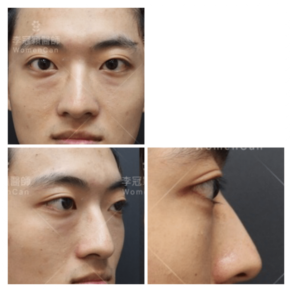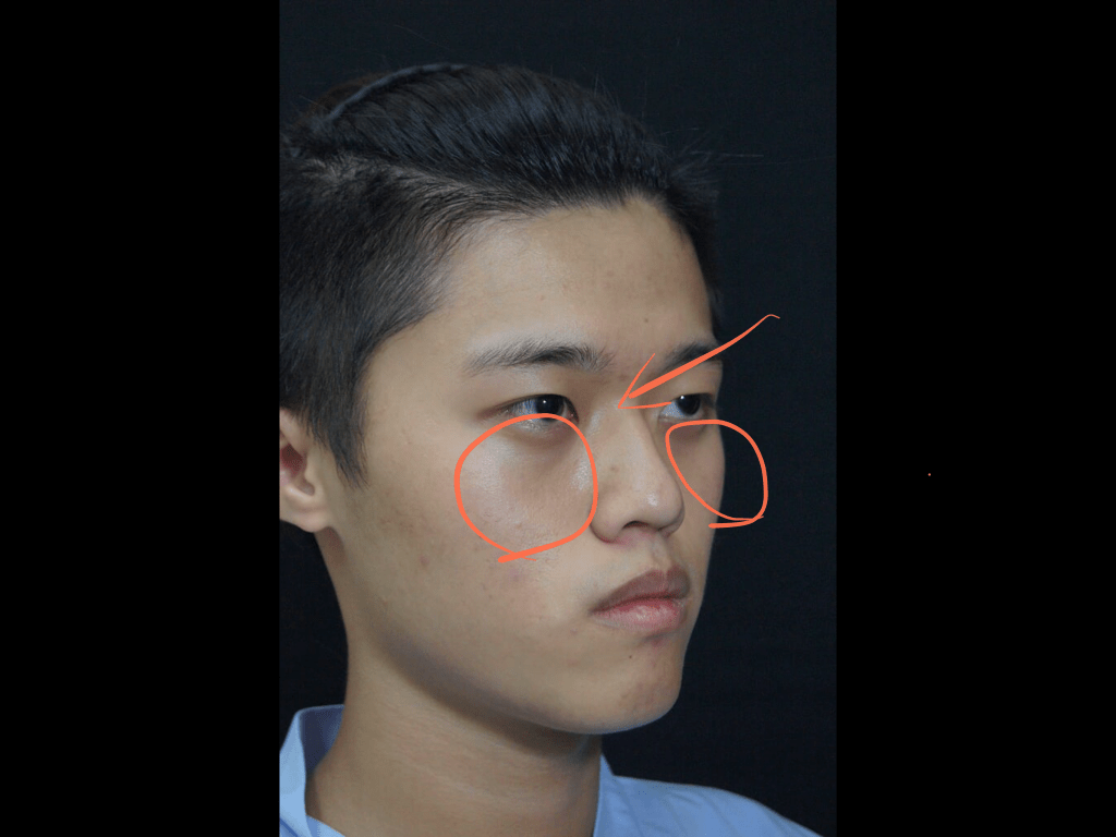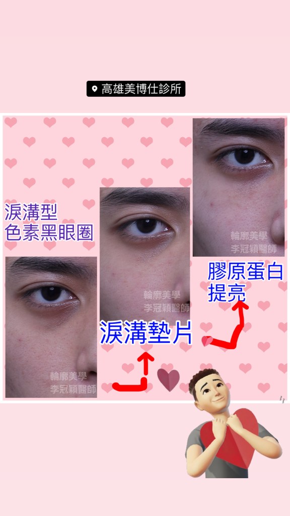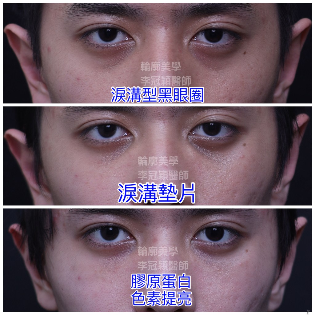 下圖:20歲男性,先天中臉骨性凹缺和眼周體質性色素,第一階段經頻果肌淚溝墊片改善骨架不足.