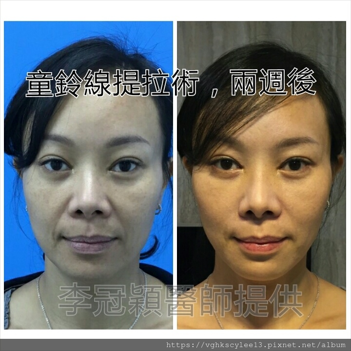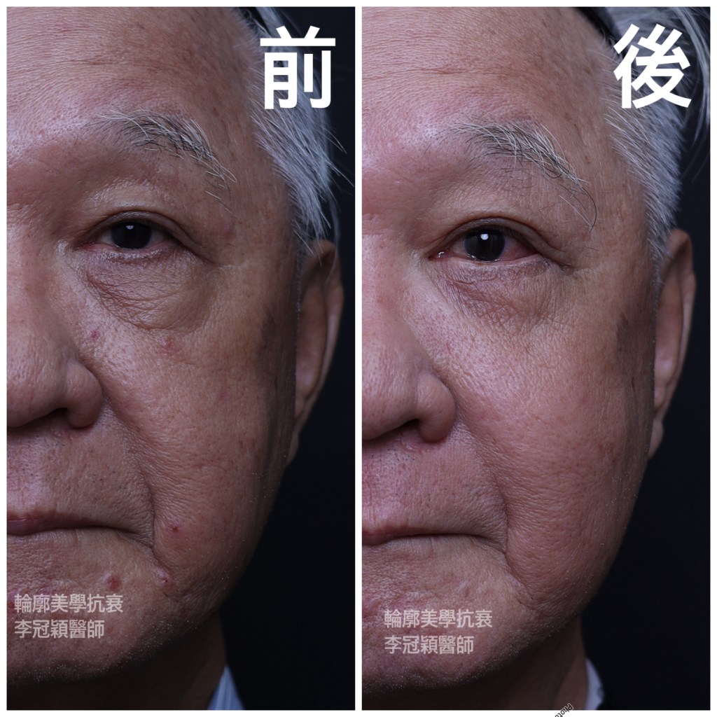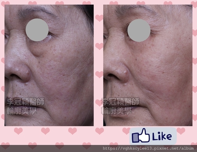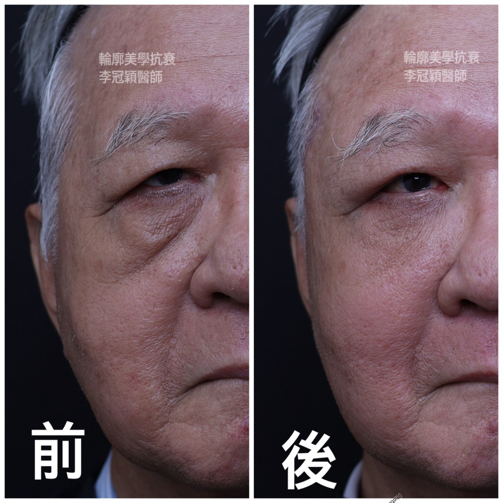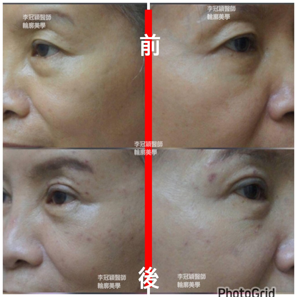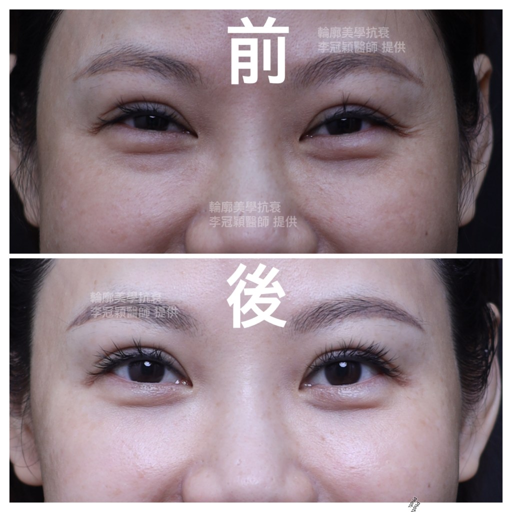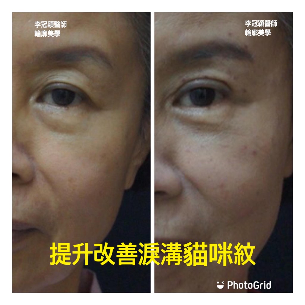 下圖:老化淚溝貓咪紋(與鬆垂有關)優先以提拉治療,改善八成避免不必要的注射劑量。連眼袋都一併改善。