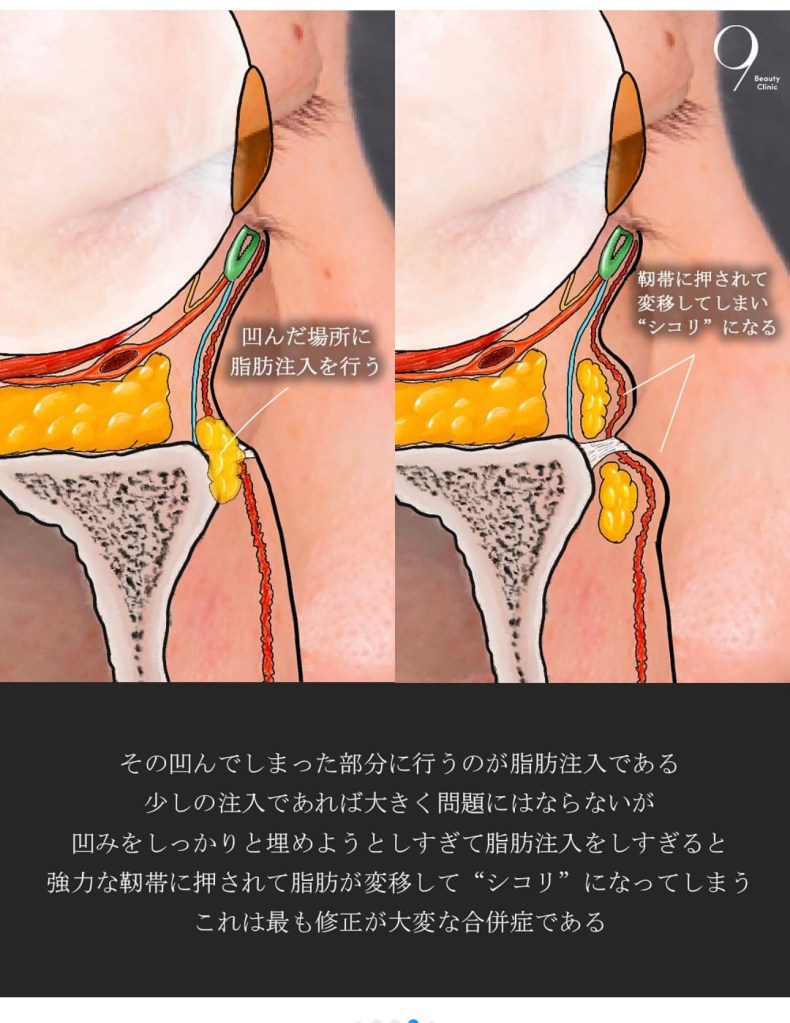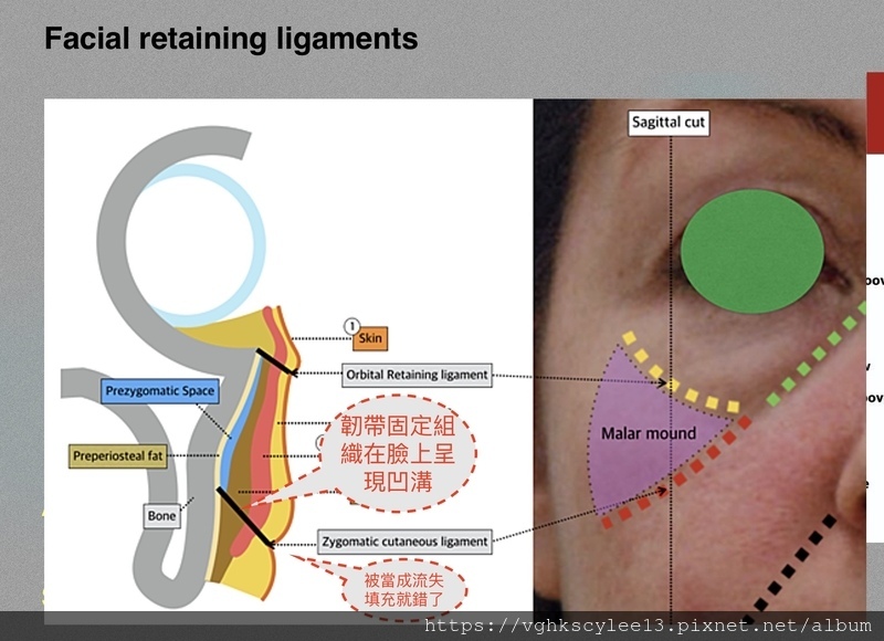 老化的中臉凹溝(跟年輕型貓咪紋完全不同)塌陷常常與顏面韌帶固定特性,骨架流失與組織流失及下垂有關。醫師只講膠原流失就要妳打填充是錯的!必須小心。