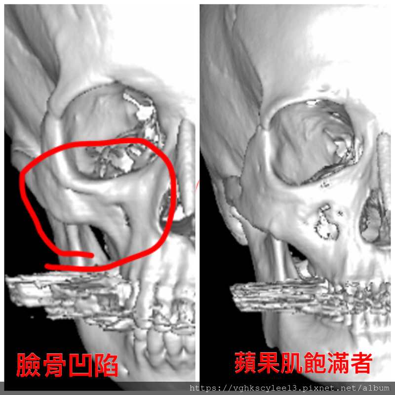 下圖:臉骨凹陷,分先天型年輕型和老化型。臉上出凹溝及眼圈(眼袋)