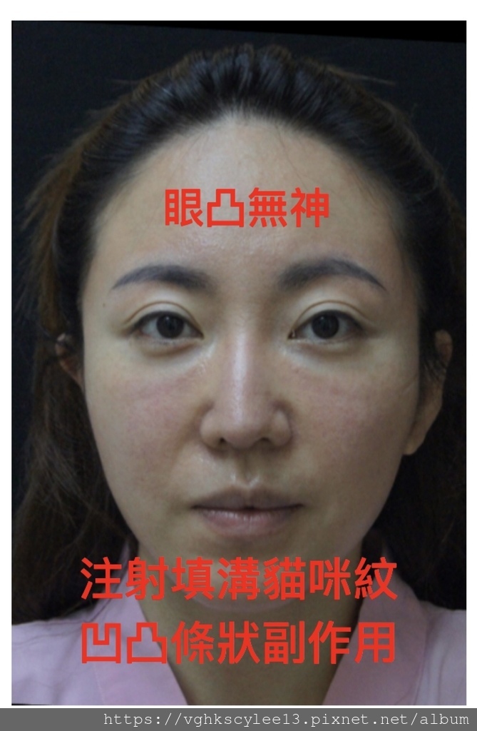 下圖黑眼圈錯誤治療注射導致饅化:下圖(眼神卡卡不自然) 原因:眼凸型假性眼袋與淚溝的黑眼圈屬於結構問題 ,必須由結構來治療!