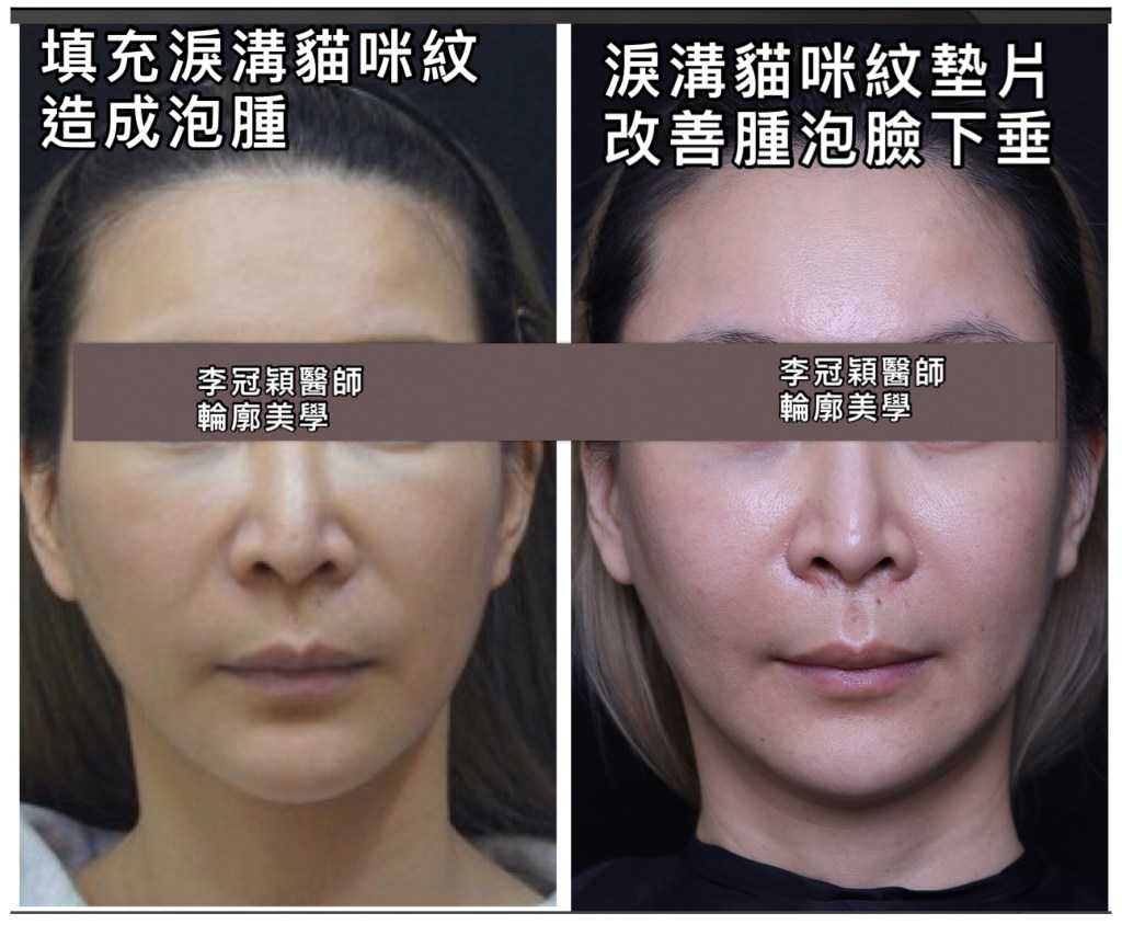 『治療』:下圖右經過淚溝韌帶剝離並且貓咪紋墊片植入,可以穩定治療淚溝貓咪紋問題,不像注射的移位凹凸吸收和變形。