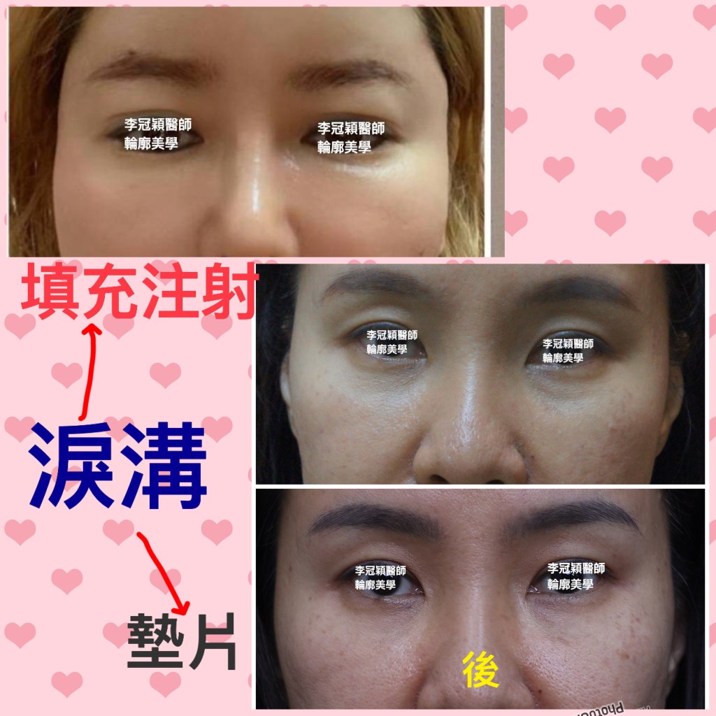 下圖:中臉骨架不足的假性眼袋和淚溝,經淚溝墊片矯正不吸收或移位不凹凸條狀變形🥰。