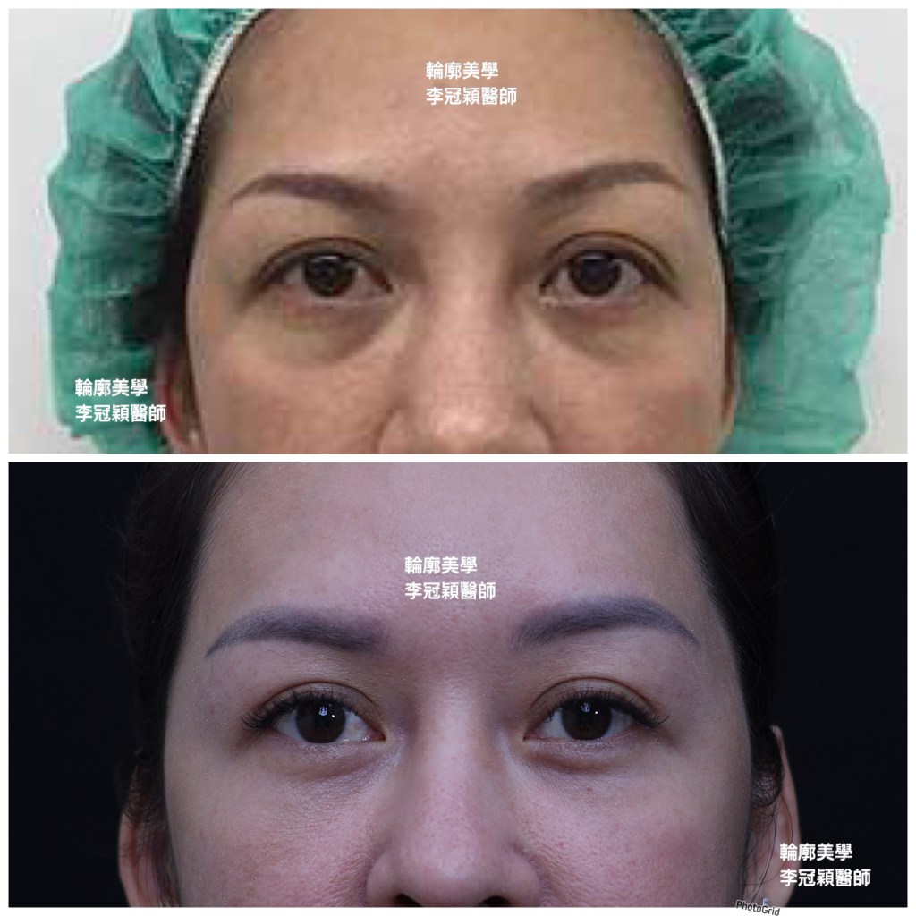 下圖:注射填充眼下和中臉造成饅化下垂老態,和表情不自然擠壓眼睛。經淚溝墊片植入提升骨架飽滿度,支撐下垂老態,表情恢復自然。