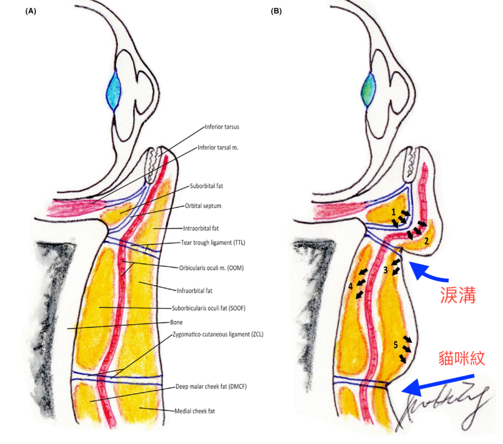 上圖:淚溝韌帶和貓咪紋韌帶固定皮膚於骨模上,所以必須針對韌帶做完整鬆解,改善牽拉凹溝,再用骨架墊片可以支撐組織並且降低韌帶牽拉的凹痕進而改善淚溝和貓咪紋。