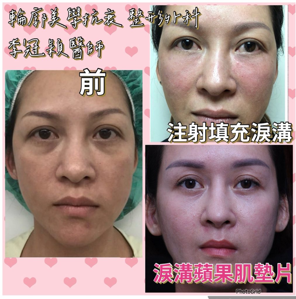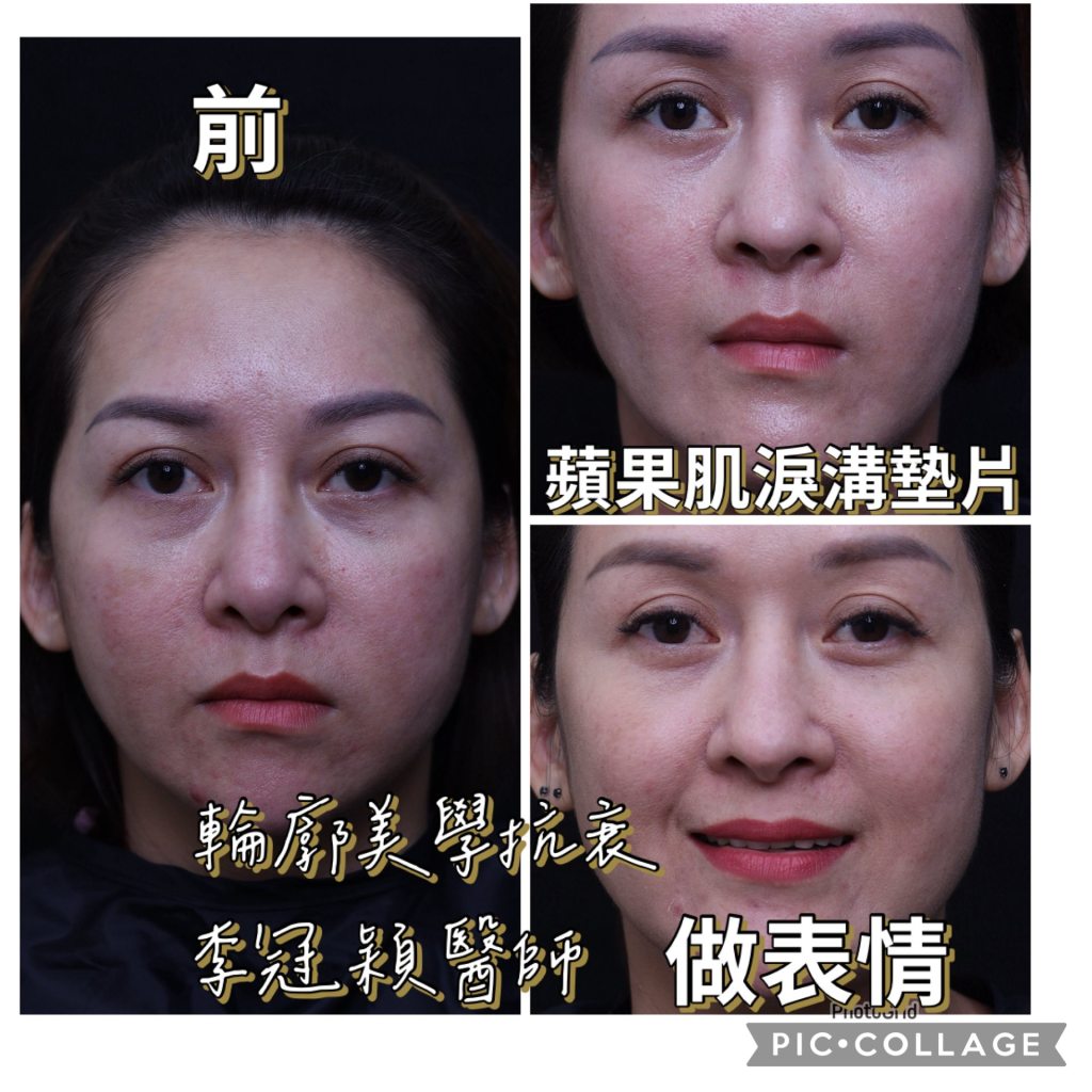 下圖範例:注射淚溝蘋果肌牽制眼周靈活度與重垂不自然,表情造成擠壓眼睛變小。經淚溝蘋果肌墊片修復支撐改善表情無神提升年輕度。