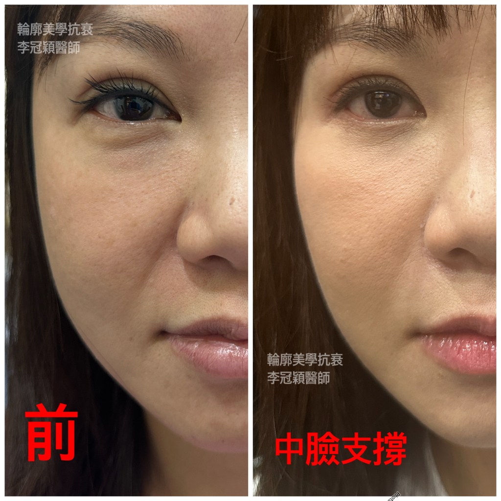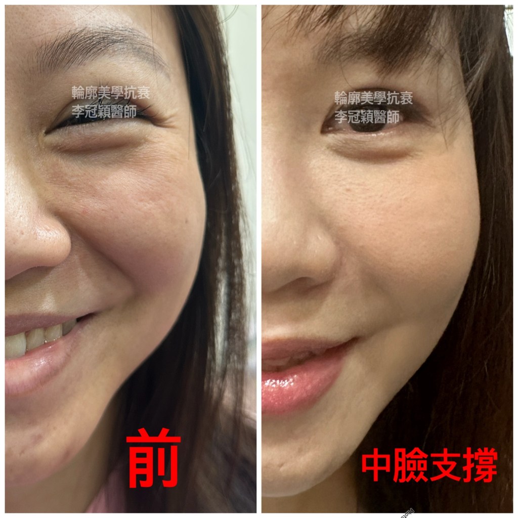 下圖老化凹溝:看似眼袋淚溝加上貓咪紋(左),其實中臉骨架缺失是主因。中臉墊片(右)支撐凹陷淚溝貓咪紋後,大幅改善👇👇👇🥰