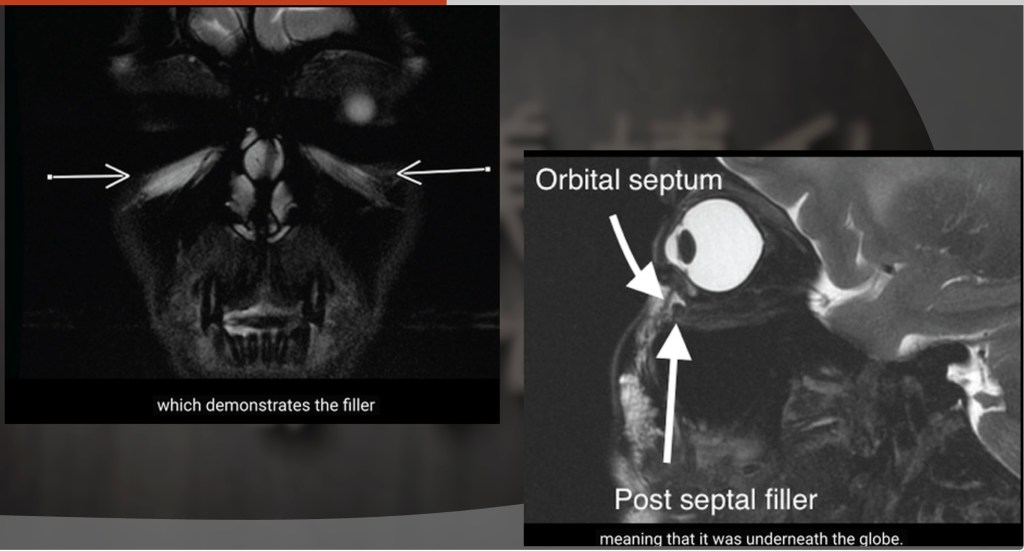 國際專家提出警語:經由核磁共振檢查發現眼下淚溝注射’材料在數年後發現跑進眼球下方…而提出淚溝注射填充治療應該質疑.
