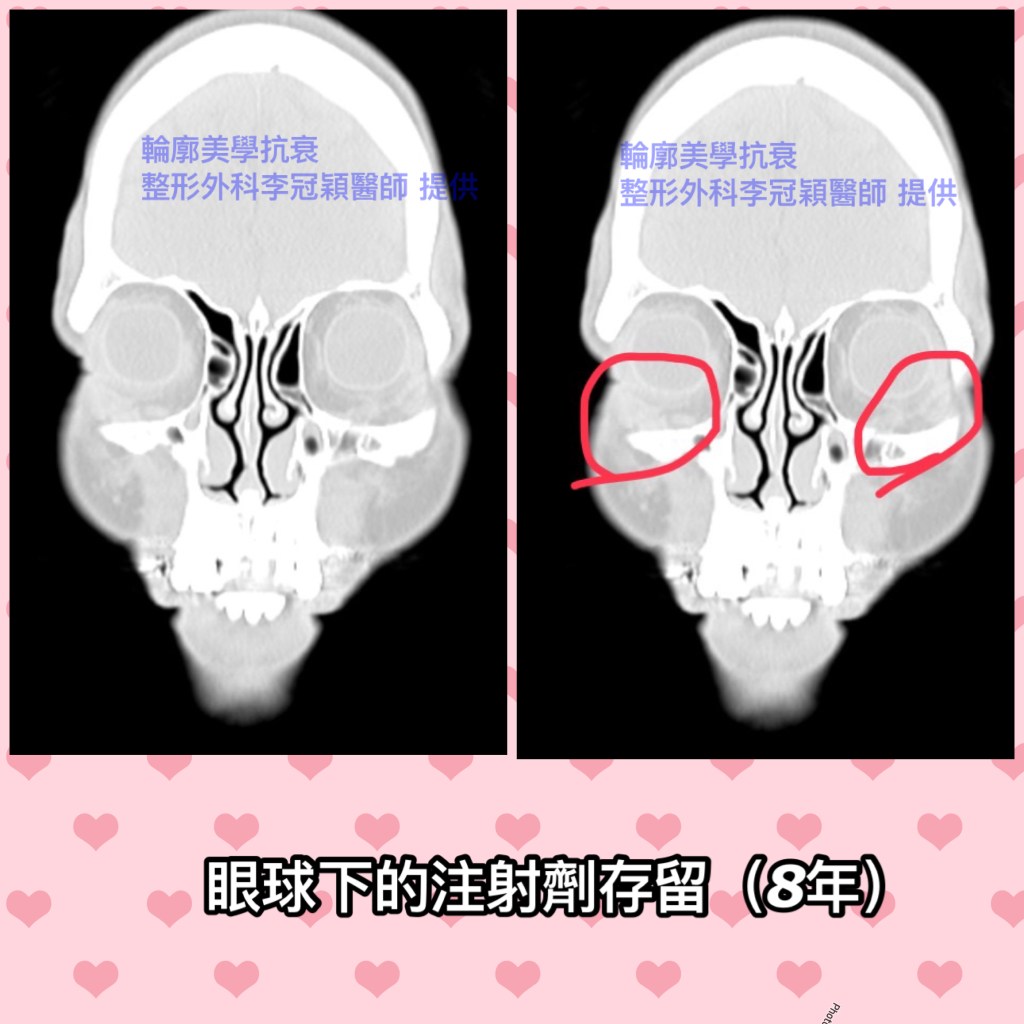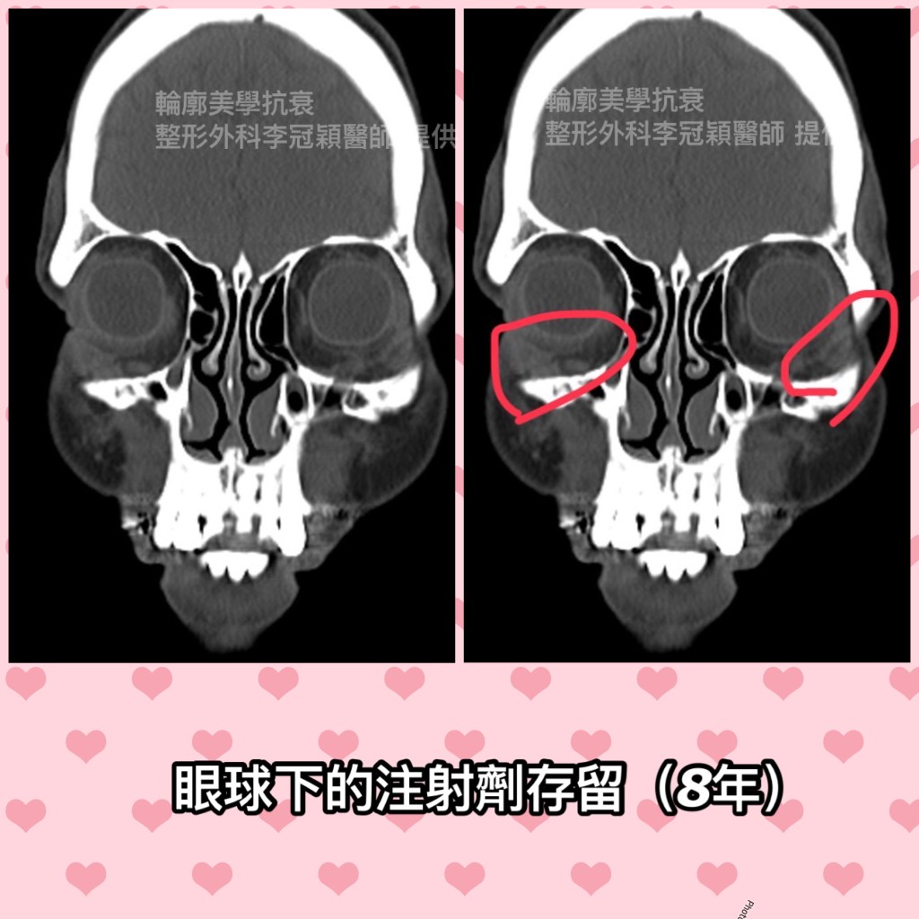 下圖電腦斷層掃描: 淚溝注射膠原蛋白刺激劑, 八年後因眼下硬結求診(吻合李醫師臨床的發先)