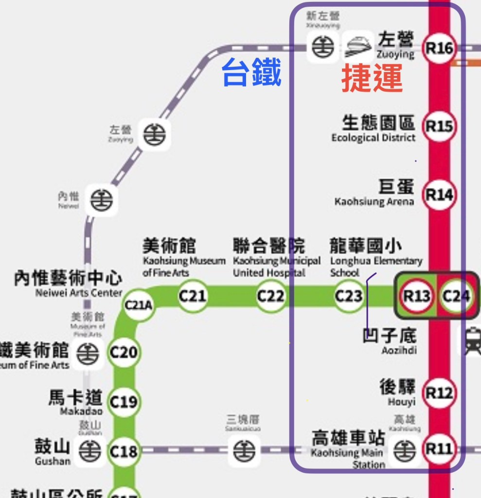 左營站搭捷運紅線(R16)–> 高雄車站(R11)下車