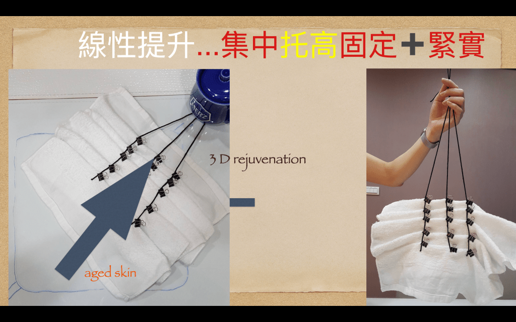針對線雕的示意圖如下:既然線雕不切除皮膚就必須將組織迴堆起來也像疊瓦如此臉才能變小。在七年前的演講,李醫師已經組了示意圖如下:黑色夾子代表倒勾或鈴鐺固定組織並且堆疊集中鬆弛組織。