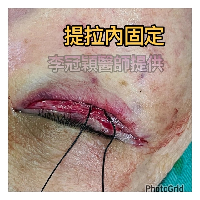 下圖:整體老化加重眼袋問題,治療老化下垂提升和眼袋回推跟修皮是完整根本治療!(三合一眼袋術)一週拆線當場。