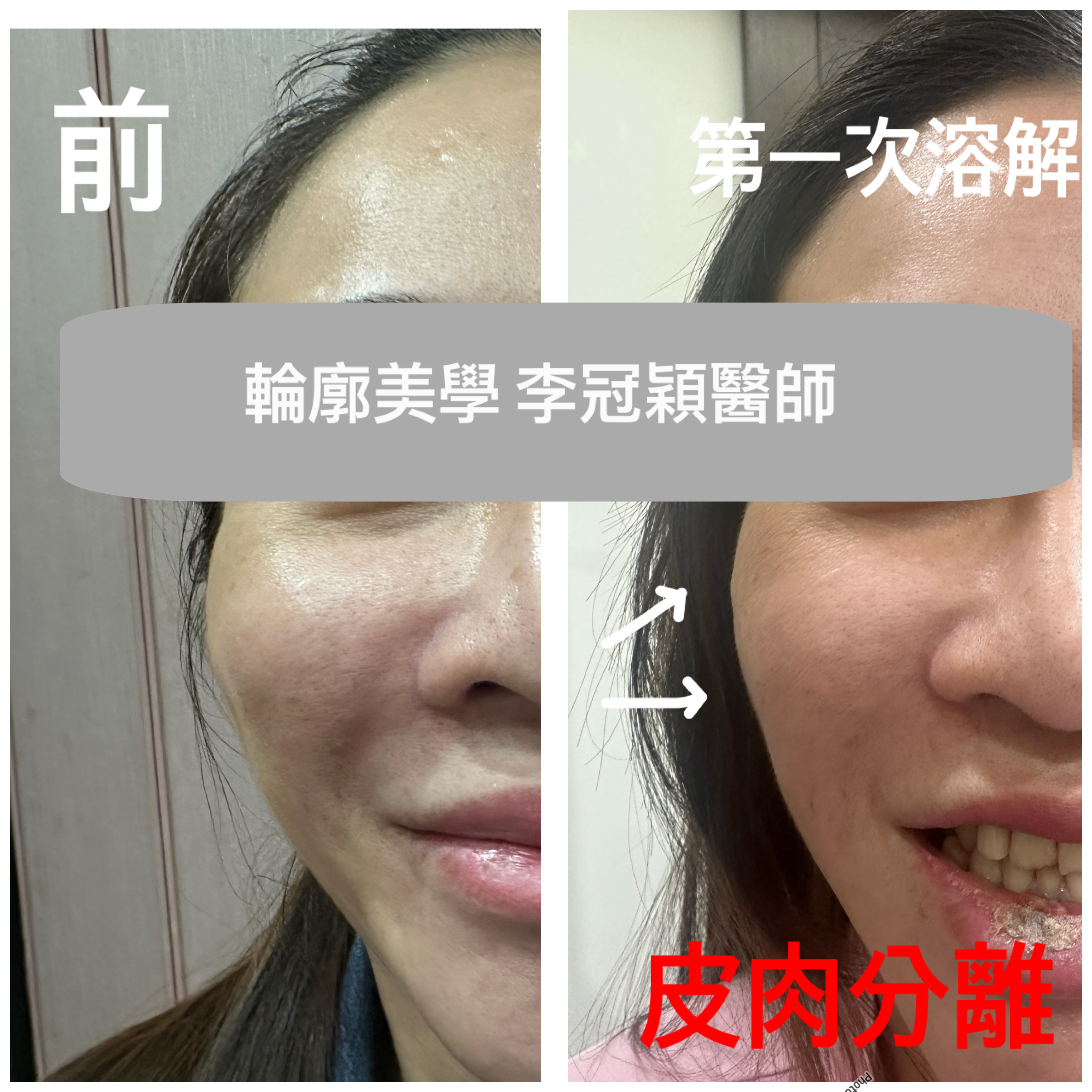 下圖:多次修補注射填充淚溝蘋果肌造成饅化加深法令紋,經兩次溶解玻尿酸後發生皮肉分離,雖改善法令垂墜狀態.