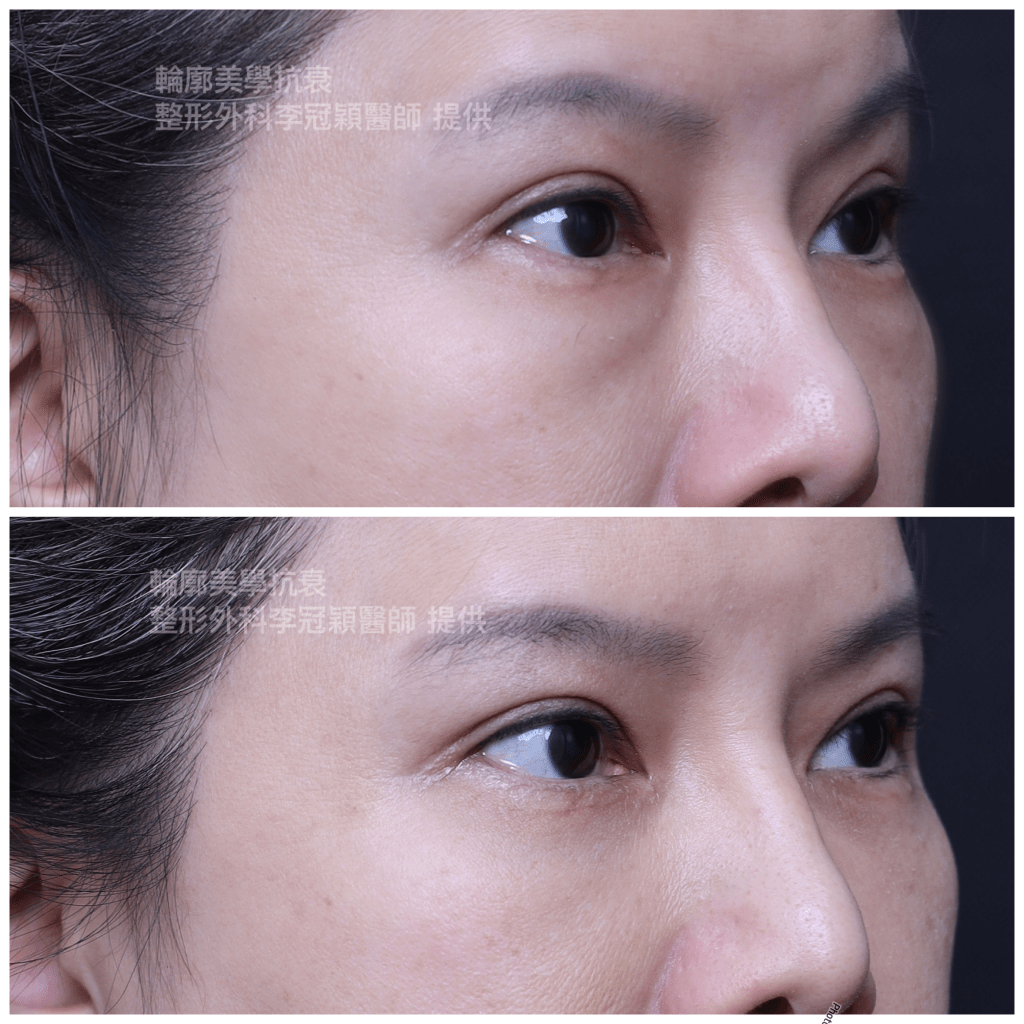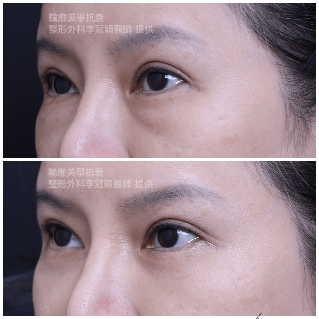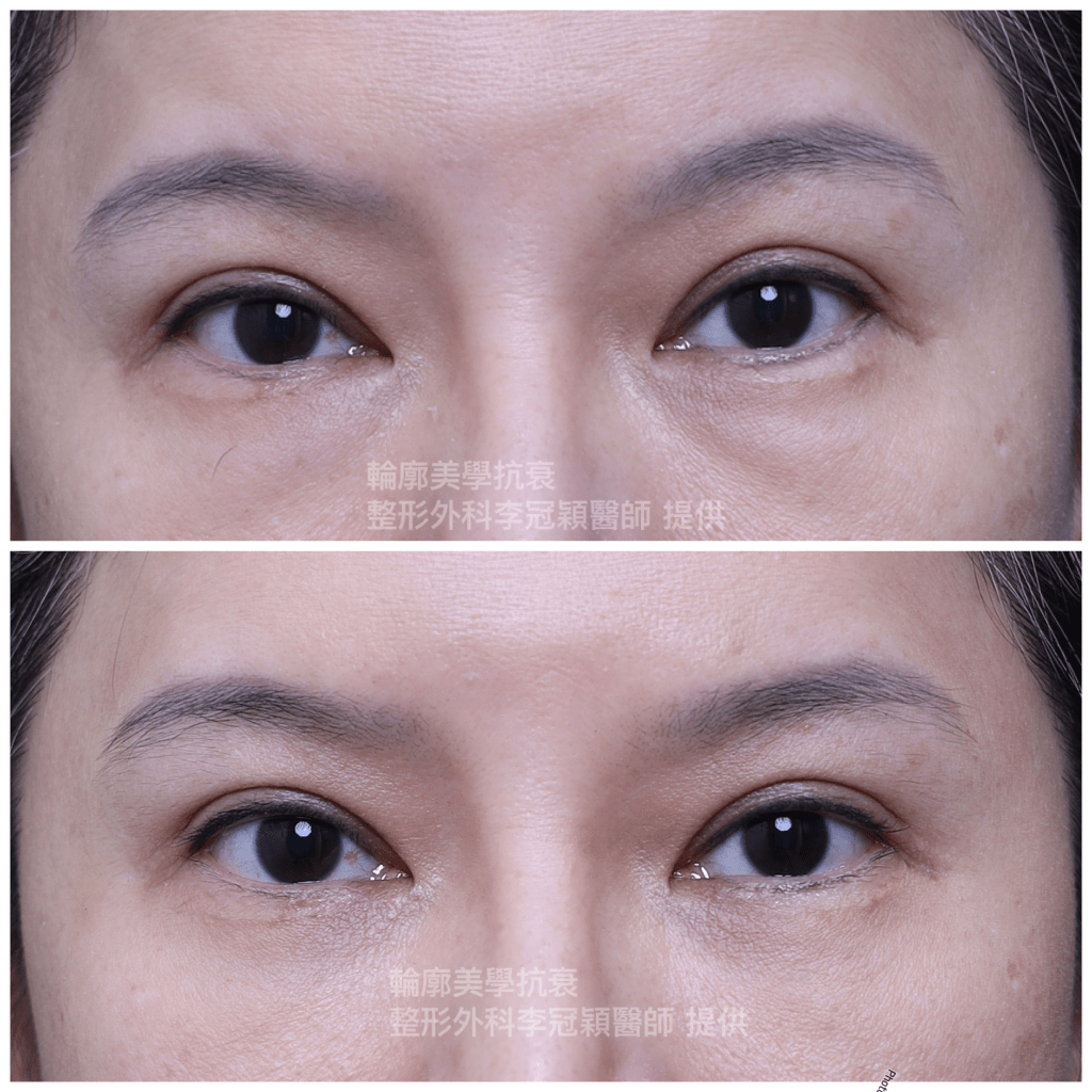 範例下圖眼凸案例:眼袋內開移除脂肪過度造成眼下凹陷問題。所以必須注意評估求美者條件(自體脂肪/玻尿酸補淚溝完全不建議)