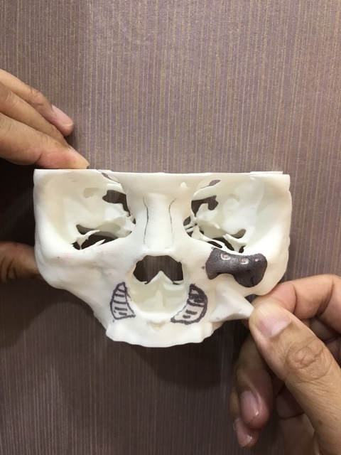2. 假體設計空間與植入位置的誤差:假體材料的固定相當重要否則可能因表情移位。空間大小設計與醫師經驗有一定關係,錯誤的大小和設計可能造成移位及表情嘴型的不自然及穿出。假體是骨性凹缺的矯正,如果層次錯誤勢必和注射材料一樣的移位和游離腫塊。
