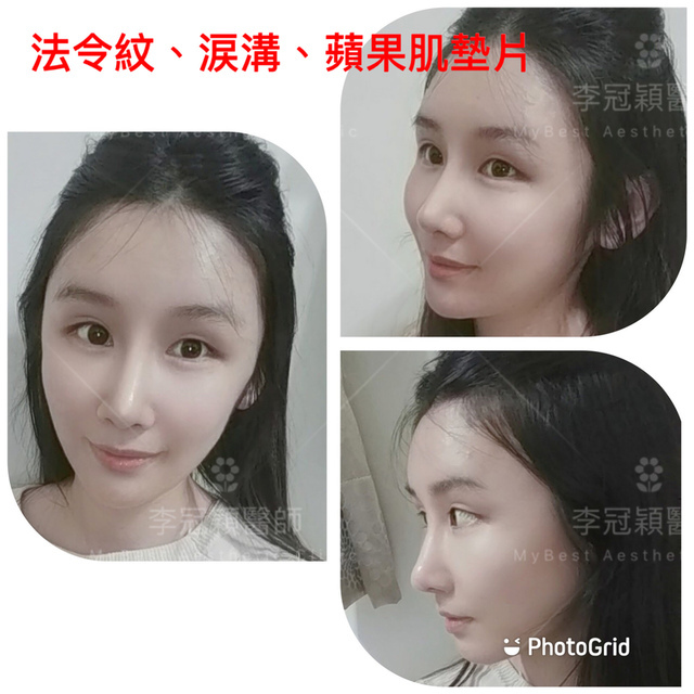 範例下圖:先天型中臉凹陷相對嘴形突出,結合中臉淚溝墊片,蘋果肌與法令紋墊片,一起改善臉部飽滿度與年輕度。