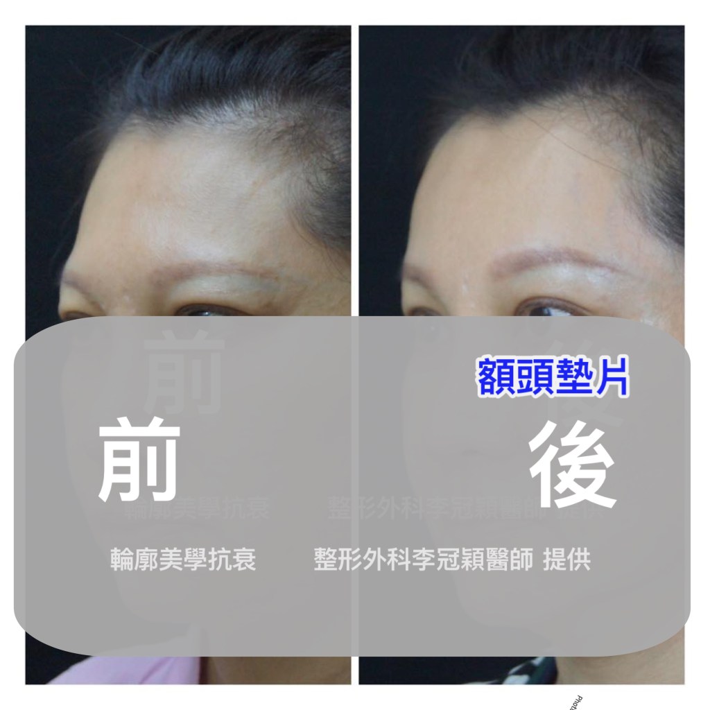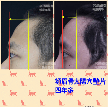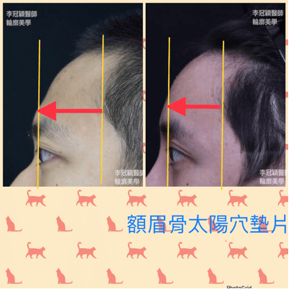 墊額頭,眉骨,太陽穴支撐不僅提眉眼皮效果(下圖眼尾和眉尾),更調整髮際線前移改善禿額外觀!這是李醫師的臨床經驗發現!