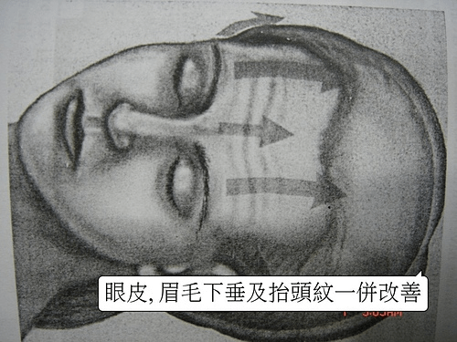 下圖:客製化額頭和太陽穴銜接加上內視鏡五爪提眉改善眉高低,自然年輕美額。