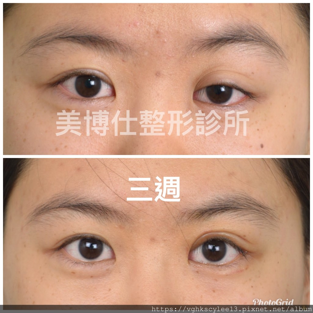 (上圖):先天雙眼皮大小邊加上輕度下垂,直搗黃龍加高單邊眼皮(縫法)改善。