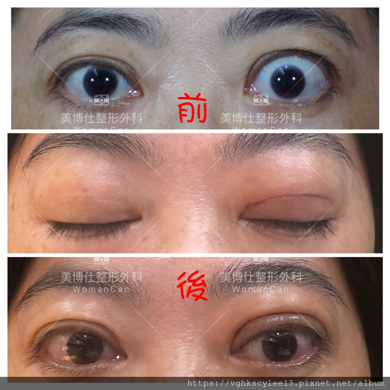 (上圖)多次手術後的不對稱,可能矯正不完全或是單邊提眼肌損傷,必須手術治療。