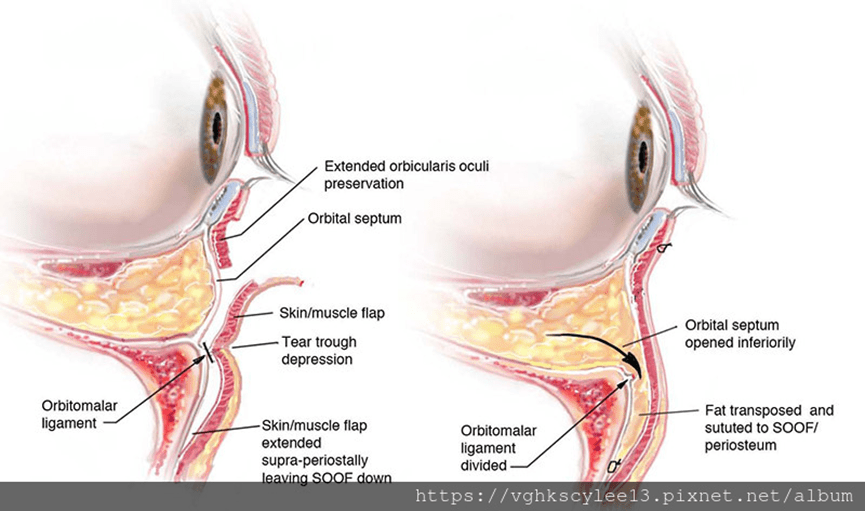 (下圖網路截圖):眼袋脂肪下拉填淚溝(B,C),可以一次性改善眼袋和淚溝。